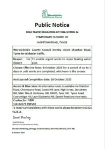Warwickshire County Council has made a Temporary Traffic Order details as indicated below: