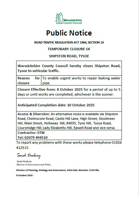 Notice is hereby given that there will be an Extra Ordinary Meeting of the Tysoe Parish Council on Monday 14th of August at 7.00pm to be held in St Mary’s Church, Tysoe.